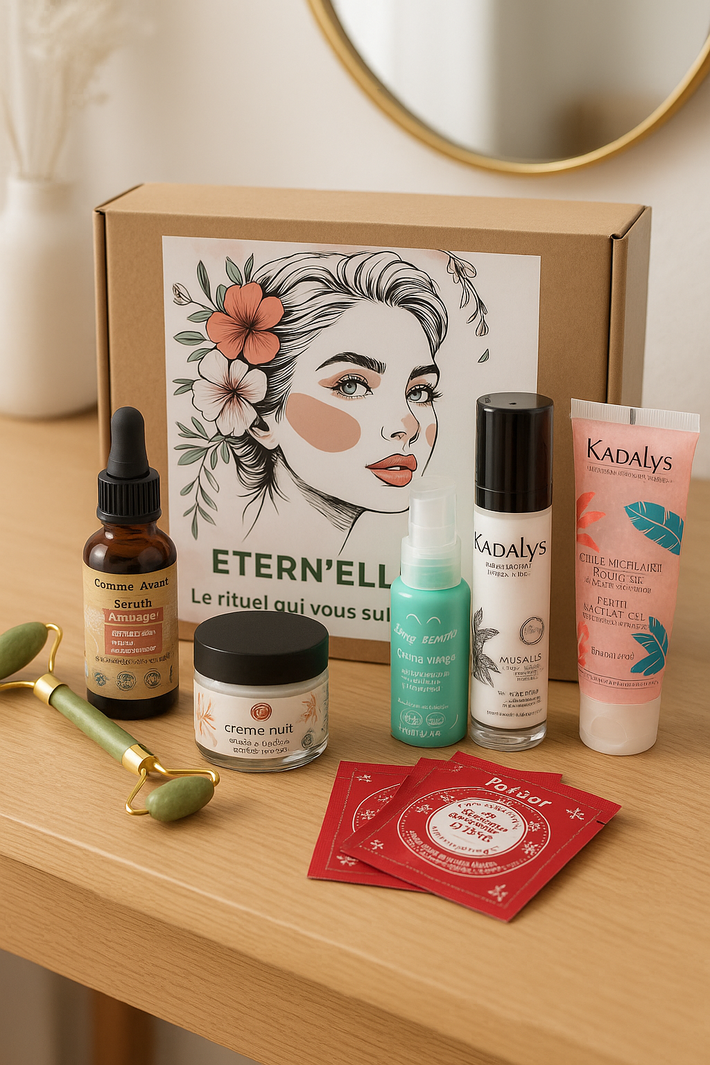 - ✔ 1 accessoire beauté (bijou, gua sha, pinceaux, tisane, rouge à lèvres…)